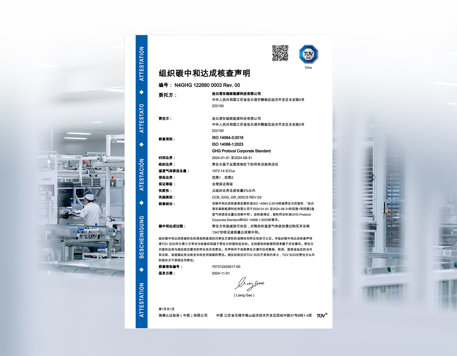 ISO 14068是ISO 14060系列首个碳中和标准。在此次认证中,T?V南德依据响应标准,对连云港基地举行了组织碳中和核查。核查效果显示,该基地妄想并接纳了有用减排步伐,通过购置国际自愿减排项目碳信用举行足额抵消,实现了碳中和,成为了名副着实的“碳中和工厂”。